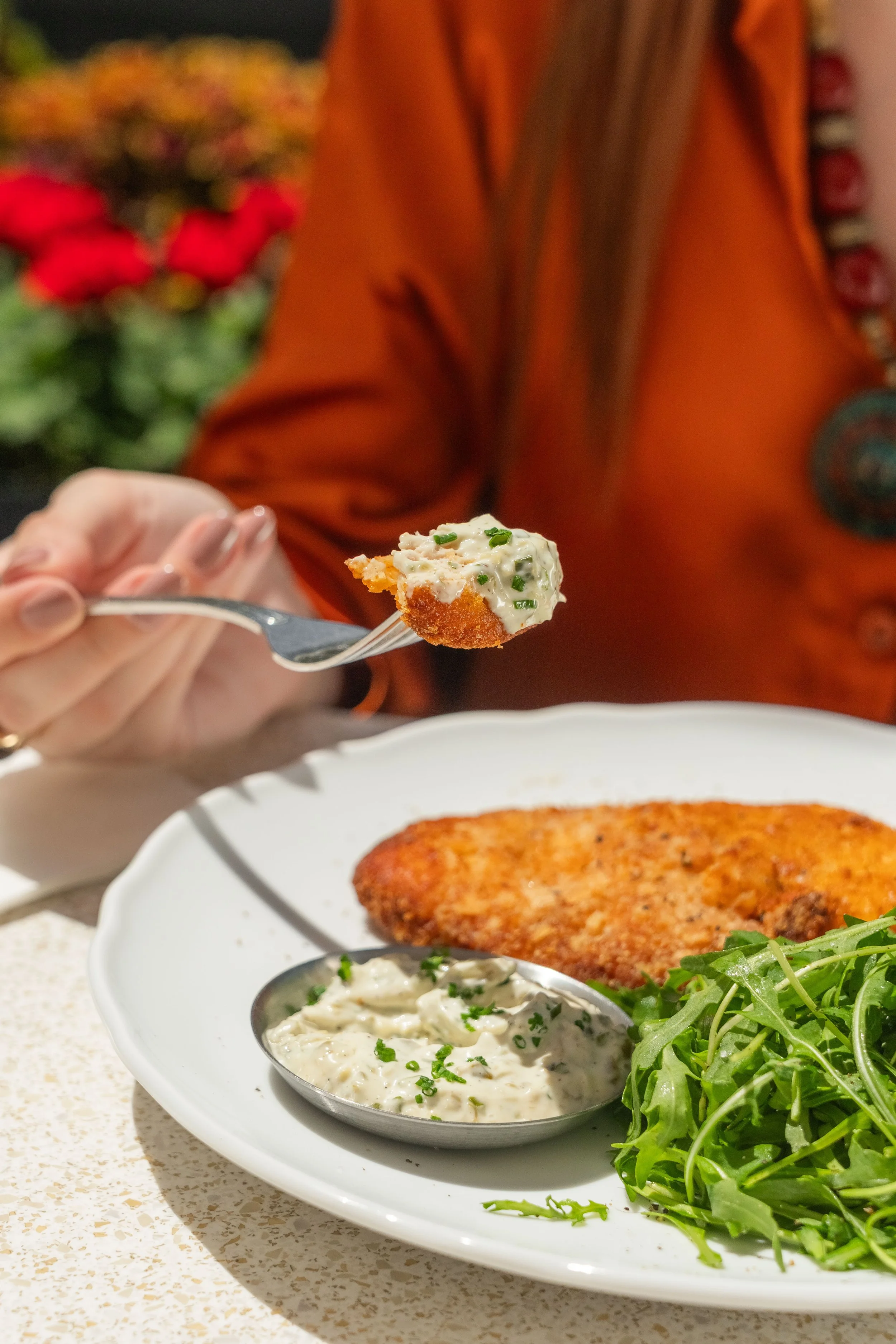 اسكالوب الدجاج ، يقدّم مع صلصة التارتار وسلطة الروكا